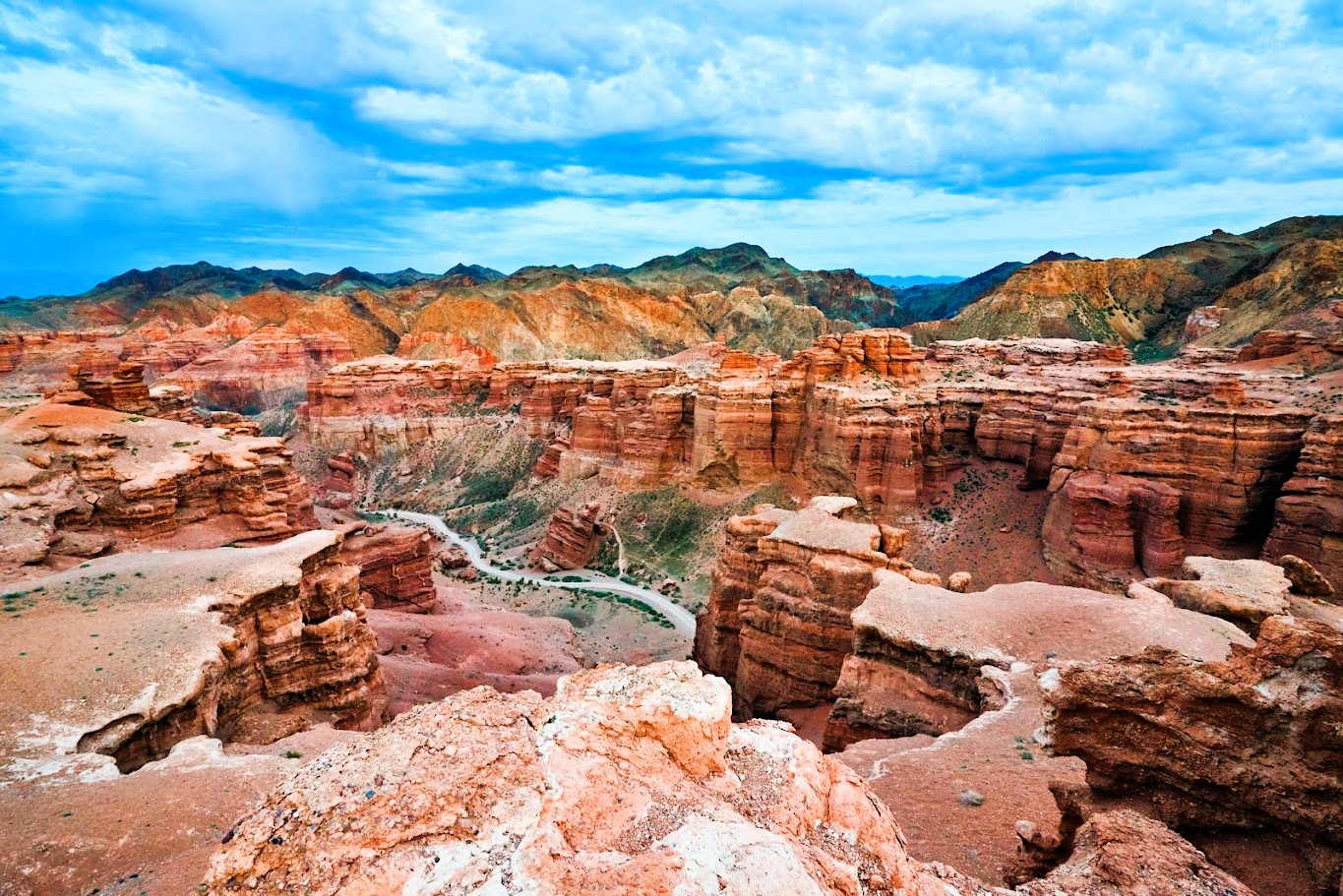 Continue to the majestic Charyn Canyon, a breathtaking natural formation often compared to the Grand Canyon for its dramatic red sandstone cliffs carved by wind and water.